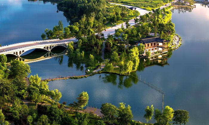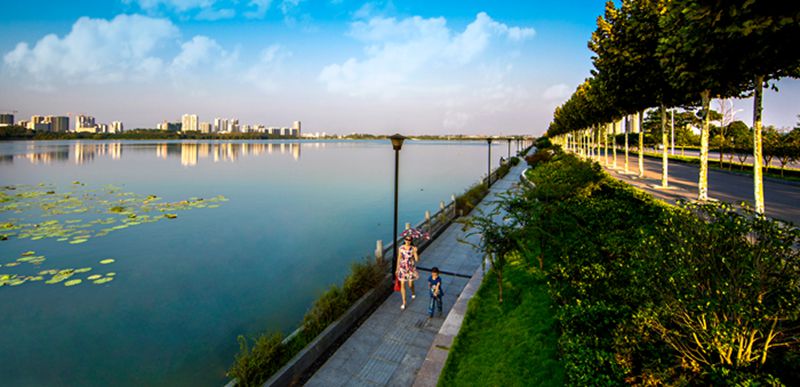平湖歸雁景區(qū)緊鄰黃州大道,規(guī)劃面積30萬(wàn)平方米。該景區(qū)視野通透,首先映入眼簾的是一灣平靜的湖水,不由得聯(lián)想起蘇東坡《西江月》中“點(diǎn)點(diǎn)樓頭細(xì)雨,重重江外平湖”的詞句。徜徉于湖邊樹(shù)下,忽見(jiàn)開(kāi)闊的湖面上空飛來(lái)一群雁陣,感受大雁歸來(lái)的喜悅,實(shí)為人生樂(lè)事。蘇東坡《調(diào)笑令》中“歸雁,歸雁。飲啄江南南岸”的詞句,也與此情此景交融相映。該景區(qū)是市民戶外運(yùn)動(dòng)休閑的功能區(qū)。